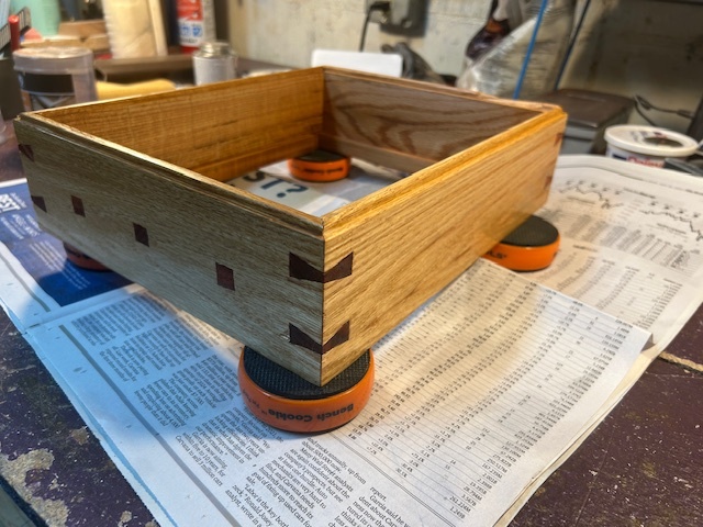 Thanks for the comment. I used the same oak flooring scraps for the sides and the splines were Wenge wood. I wasn’t quite satisfied with the placement of the splines so the next spline box, made with padauk splines, I liked a bit better. Photo attached.